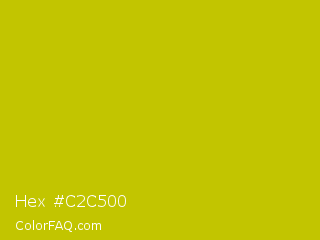 Hex #c2c500 Color is a normal yellow color and the nearest color is Rio Grande #bbd009. Hex code #c2c500 and RGB value is rgb(194,197,0). In RGB color space, this color is composed of 76% red, 77% green, 0% blue, In CMYK color space, this color is composed of 2% cyan, 0% magenta, 100% yellow , 23% black , In HSL color space, this color has a hue angle of 61° , 100% saturation and 39% lightness.