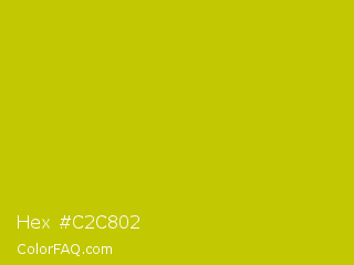 Hex #c2c802 Color is a normal yellow color and the nearest color is Rio Grande #bbd009. Hex code #c2c802 and RGB value is rgb(194,200,2). In RGB color space, this color is composed of 76% red, 78% green, 1% blue, In CMYK color space, this color is composed of 3% cyan, 0% magenta, 99% yellow , 22% black , In HSL color space, this color has a hue angle of 62° , 98% saturation and 40% lightness.