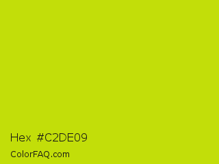 Hex #c2de09 Color is a normal yellow color and the nearest color is Fuego #bede0d. Hex code #c2de09 and RGB value is rgb(194,222,9). In RGB color space, this color is composed of 76% red, 87% green, 4% blue, In CMYK color space, this color is composed of 13% cyan, 0% magenta, 96% yellow , 13% black , In HSL color space, this color has a hue angle of 68° , 92% saturation and 45% lightness.