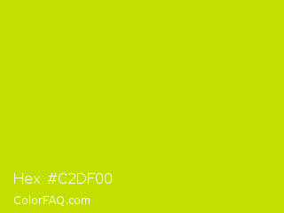 Hex #c2df00 Color is a normal yellow color and the nearest color is Fuego #bede0d. Hex code #c2df00 and RGB value is rgb(194,223,0). In RGB color space, this color is composed of 76% red, 87% green, 0% blue, In CMYK color space, this color is composed of 13% cyan, 0% magenta, 100% yellow , 13% black , In HSL color space, this color has a hue angle of 68° , 100% saturation and 44% lightness.