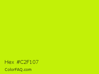 Hex #c2f107 Color is a normal lime color and the nearest color is Las Palmas #c6e610. Hex code #c2f107 and RGB value is rgb(194,241,7). In RGB color space, this color is composed of 76% red, 95% green, 3% blue, In CMYK color space, this color is composed of 20% cyan, 0% magenta, 97% yellow , 5% black , In HSL color space, this color has a hue angle of 72° , 94% saturation and 49% lightness.