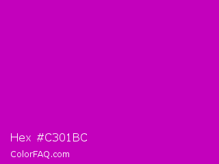 Hex #c301bc Color is a normal magenta color and the nearest color is Deep Magenta #cc00cc. Hex code #c301bc and RGB value is rgb(195,1,188). In RGB color space, this color is composed of 76% red, 0% green, 74% blue, In CMYK color space, this color is composed of 0% cyan, 99% magenta, 4% yellow , 24% black , In HSL color space, this color has a hue angle of 302° , 99% saturation and 38% lightness.