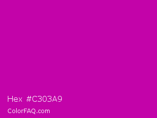 Hex #c303a9 Color is a normal magenta color and the nearest color is Heliotrope Magenta #aa00bb. Hex code #c303a9 and RGB value is rgb(195,3,169). In RGB color space, this color is composed of 76% red, 1% green, 66% blue, In CMYK color space, this color is composed of 0% cyan, 98% magenta, 13% yellow , 24% black , In HSL color space, this color has a hue angle of 308° , 97% saturation and 39% lightness.