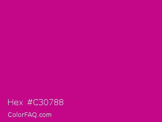 Hex #c30788 Color is a normal magenta color and the nearest color is Red Violet #c71585. Hex code #c30788 and RGB value is rgb(195,7,136). In RGB color space, this color is composed of 76% red, 3% green, 53% blue, In CMYK color space, this color is composed of 0% cyan, 96% magenta, 30% yellow , 24% black , In HSL color space, this color has a hue angle of 319° , 93% saturation and 40% lightness.