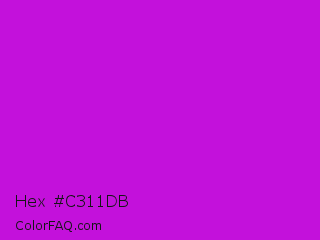Hex #c311db Color is a normal magenta color and the nearest color is Vivid Mulberry #b80ce3. Hex code #c311db and RGB value is rgb(195,17,219). In RGB color space, this color is composed of 76% red, 7% green, 86% blue, In CMYK color space, this color is composed of 11% cyan, 92% magenta, 0% yellow , 14% black , In HSL color space, this color has a hue angle of 293° , 86% saturation and 46% lightness.
