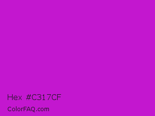 Hex #c317cf Color is a normal magenta color and the nearest color is Deep Magenta #cc00cc. Hex code #c317cf and RGB value is rgb(195,23,207). In RGB color space, this color is composed of 76% red, 9% green, 81% blue, In CMYK color space, this color is composed of 6% cyan, 89% magenta, 0% yellow , 19% black , In HSL color space, this color has a hue angle of 296° , 80% saturation and 45% lightness.