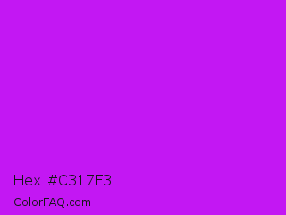 Hex #c317f3 Color is a normal purple color and the nearest color is Vivid Mulberry #b80ce3. Hex code #c317f3 and RGB value is rgb(195,23,243). In RGB color space, this color is composed of 76% red, 9% green, 95% blue, In CMYK color space, this color is composed of 20% cyan, 91% magenta, 0% yellow , 5% black , In HSL color space, this color has a hue angle of 287° , 90% saturation and 52% lightness.