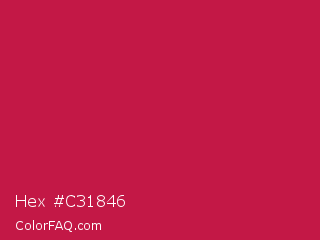 Hex #c31846 Color is a normal rose color and the nearest color is Maroon Flush #c32148. Hex code #c31846 and RGB value is rgb(195,24,70). In RGB color space, this color is composed of 76% red, 9% green, 27% blue, In CMYK color space, this color is composed of 0% cyan, 88% magenta, 64% yellow , 24% black , In HSL color space, this color has a hue angle of 344° , 78% saturation and 43% lightness.