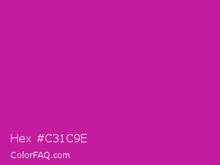 Hex #c31c9e Color is a normal magenta color and the nearest color is Royal Fuchsia #ca2c92. Hex code #c31c9e and RGB value is rgb(195,28,158). In RGB color space, this color is composed of 76% red, 11% green, 62% blue, In CMYK color space, this color is composed of 0% cyan, 86% magenta, 19% yellow , 24% black , In HSL color space, this color has a hue angle of 313° , 75% saturation and 44% lightness.