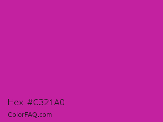 Hex #c321a0 Color is a normal magenta color and the nearest color is Royal Fuchsia #ca2c92. Hex code #c321a0 and RGB value is rgb(195,33,160). In RGB color space, this color is composed of 76% red, 13% green, 63% blue, In CMYK color space, this color is composed of 0% cyan, 83% magenta, 18% yellow , 24% black , In HSL color space, this color has a hue angle of 313° , 71% saturation and 45% lightness.