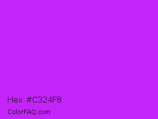 Hex #c324f8 Color is a normal purple color and the nearest color is Vivid Mulberry #b80ce3. Hex code #c324f8 and RGB value is rgb(195,36,248). In RGB color space, this color is composed of 76% red, 14% green, 97% blue, In CMYK color space, this color is composed of 21% cyan, 85% magenta, 0% yellow , 3% black , In HSL color space, this color has a hue angle of 285° , 94% saturation and 56% lightness.
