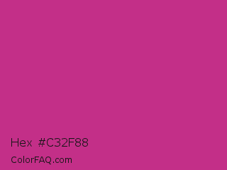 Hex #c32f88 Color is a normal magenta color and the nearest color is Medium Red Violet #bb3385. Hex code #c32f88 and RGB value is rgb(195,47,136). In RGB color space, this color is composed of 76% red, 18% green, 53% blue, In CMYK color space, this color is composed of 0% cyan, 76% magenta, 30% yellow , 24% black , In HSL color space, this color has a hue angle of 324° , 61% saturation and 47% lightness.