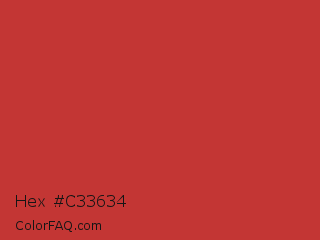 Hex #c33634 Color is a normal red color and the nearest color is Flush Mahogany #ca3435. Hex code #c33634 and RGB value is rgb(195,54,52). In RGB color space, this color is composed of 76% red, 21% green, 20% blue, In CMYK color space, this color is composed of 0% cyan, 72% magenta, 73% yellow , 24% black , In HSL color space, this color has a hue angle of 1° , 58% saturation and 48% lightness.