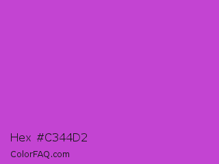 Hex #c344d2 Color is a normal magenta color and the nearest color is Medium Orchid #ba55d3. Hex code #c344d2 and RGB value is rgb(195,68,210). In RGB color space, this color is composed of 76% red, 27% green, 82% blue, In CMYK color space, this color is composed of 7% cyan, 68% magenta, 0% yellow , 18% black , In HSL color space, this color has a hue angle of 294° , 61% saturation and 55% lightness.