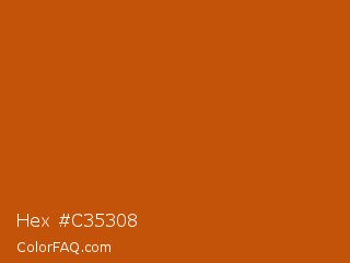 Hex #c35308 Color is a normal orange color and the nearest color is Rose Of Sharon #bf5500. Hex code #c35308 and RGB value is rgb(195,83,8). In RGB color space, this color is composed of 76% red, 33% green, 3% blue, In CMYK color space, this color is composed of 0% cyan, 57% magenta, 96% yellow , 24% black , In HSL color space, this color has a hue angle of 24° , 92% saturation and 40% lightness.