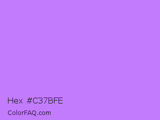 Hex #c37bfe Color is a light purple color and the nearest color is Heliotrope #df73ff. Hex code #c37bfe and RGB value is rgb(195,123,254). In RGB color space, this color is composed of 76% red, 48% green, 100% blue, In CMYK color space, this color is composed of 23% cyan, 52% magenta, 0% yellow , 0% black , In HSL color space, this color has a hue angle of 273° , 98% saturation and 74% lightness.