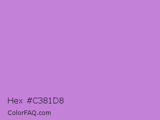 Hex #c381d8 Color is a light purple color and the nearest color is Lavender #b57edc. Hex code #c381d8 and RGB value is rgb(195,129,216). In RGB color space, this color is composed of 76% red, 51% green, 85% blue, In CMYK color space, this color is composed of 10% cyan, 40% magenta, 0% yellow , 15% black , In HSL color space, this color has a hue angle of 286° , 53% saturation and 68% lightness.