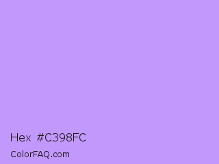 Hex #c398fc Color is a light violet color and the nearest color is Pale Violet #cc99ff. Hex code #c398fc and RGB value is rgb(195,152,252). In RGB color space, this color is composed of 76% red, 60% green, 99% blue, In CMYK color space, this color is composed of 23% cyan, 40% magenta, 0% yellow , 1% black , In HSL color space, this color has a hue angle of 266° , 94% saturation and 79% lightness.