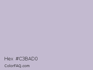 Hex #c3bad0 Color is a light violet color and the nearest color is Gray Suit #c1becd. Hex code #c3bad0 and RGB value is rgb(195,186,208). In RGB color space, this color is composed of 76% red, 73% green, 82% blue, In CMYK color space, this color is composed of 6% cyan, 11% magenta, 0% yellow , 18% black , In HSL color space, this color has a hue angle of 265° , 19% saturation and 77% lightness.