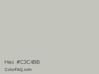Hex #c3c4bb Color is a light yellow color and the nearest color is Mist Gray #c4c4bc. Hex code #c3c4bb and RGB value is rgb(195,196,187). In RGB color space, this color is composed of 76% red, 77% green, 73% blue, In CMYK color space, this color is composed of 1% cyan, 0% magenta, 5% yellow , 23% black , In HSL color space, this color has a hue angle of 67° , 7% saturation and 75% lightness.