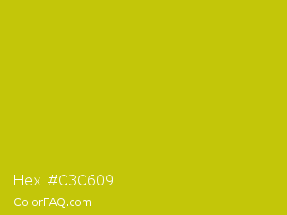 Hex #c3c609 Color is a normal yellow color and the nearest color is Rio Grande #bbd009. Hex code #c3c609 and RGB value is rgb(195,198,9). In RGB color space, this color is composed of 76% red, 78% green, 4% blue, In CMYK color space, this color is composed of 2% cyan, 0% magenta, 95% yellow , 22% black , In HSL color space, this color has a hue angle of 61° , 91% saturation and 41% lightness.