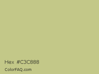 Hex #c3c888 Color is a light yellow color and the nearest color is Pine Glade #c7cd90. Hex code #c3c888 and RGB value is rgb(195,200,136). In RGB color space, this color is composed of 76% red, 78% green, 53% blue, In CMYK color space, this color is composed of 3% cyan, 0% magenta, 32% yellow , 22% black , In HSL color space, this color has a hue angle of 65° , 37% saturation and 66% lightness.