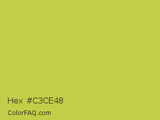 Hex #c3ce48 Color is a normal yellow color and the nearest color is June Bud #bdda57. Hex code #c3ce48 and RGB value is rgb(195,206,72). In RGB color space, this color is composed of 76% red, 81% green, 28% blue, In CMYK color space, this color is composed of 5% cyan, 0% magenta, 65% yellow , 19% black , In HSL color space, this color has a hue angle of 65° , 58% saturation and 55% lightness.