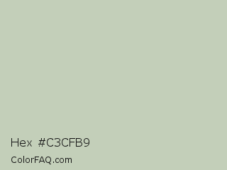 Hex #c3cfb9 Color is a light green color and the nearest color is Pale Leaf #c0d3b9. Hex code #c3cfb9 and RGB value is rgb(195,207,185). In RGB color space, this color is composed of 76% red, 81% green, 73% blue, In CMYK color space, this color is composed of 6% cyan, 0% magenta, 11% yellow , 19% black , In HSL color space, this color has a hue angle of 93° , 19% saturation and 77% lightness.