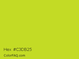 Hex #c3db25 Color is a normal yellow color and the nearest color is Key Lime Pie #bfc921. Hex code #c3db25 and RGB value is rgb(195,219,37). In RGB color space, this color is composed of 76% red, 86% green, 15% blue, In CMYK color space, this color is composed of 11% cyan, 0% magenta, 83% yellow , 14% black , In HSL color space, this color has a hue angle of 68° , 72% saturation and 50% lightness.