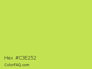Hex #c3e252 Color is a normal lime color and the nearest color is June Bud #bdda57. Hex code #c3e252 and RGB value is rgb(195,226,82). In RGB color space, this color is composed of 76% red, 89% green, 32% blue, In CMYK color space, this color is composed of 14% cyan, 0% magenta, 64% yellow , 11% black , In HSL color space, this color has a hue angle of 73° , 71% saturation and 60% lightness.