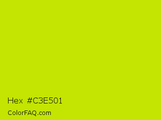 Hex #c3e501 Color is a normal yellow color and the nearest color is Bitter Lemon #cae00d. Hex code #c3e501 and RGB value is rgb(195,229,1). In RGB color space, this color is composed of 76% red, 90% green, 0% blue, In CMYK color space, this color is composed of 15% cyan, 0% magenta, 100% yellow , 10% black , In HSL color space, this color has a hue angle of 69° , 99% saturation and 45% lightness.