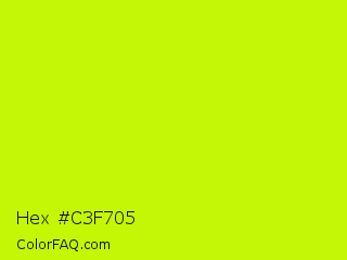 Hex #c3f705 Color is a normal lime color and the nearest color is Lime #bfff00. Hex code #c3f705 and RGB value is rgb(195,247,5). In RGB color space, this color is composed of 76% red, 97% green, 2% blue, In CMYK color space, this color is composed of 21% cyan, 0% magenta, 98% yellow , 3% black , In HSL color space, this color has a hue angle of 73° , 96% saturation and 49% lightness.