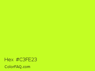 Hex #c3fe23 Color is a normal lime color and the nearest color is Arctic Lime #d0ff14. Hex code #c3fe23 and RGB value is rgb(195,254,35). In RGB color space, this color is composed of 76% red, 100% green, 14% blue, In CMYK color space, this color is composed of 23% cyan, 0% magenta, 86% yellow , 0% black , In HSL color space, this color has a hue angle of 76° , 99% saturation and 57% lightness.