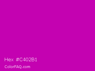 Hex #c402b1 Color is a normal magenta color and the nearest color is Heliotrope Magenta #aa00bb. Hex code #c402b1 and RGB value is rgb(196,2,177). In RGB color space, this color is composed of 77% red, 1% green, 69% blue, In CMYK color space, this color is composed of 0% cyan, 99% magenta, 10% yellow , 23% black , In HSL color space, this color has a hue angle of 306° , 98% saturation and 39% lightness.