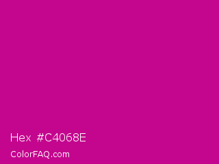 Hex #c4068e Color is a normal magenta color and the nearest color is Red Violet #c71585. Hex code #c4068e and RGB value is rgb(196,6,142). In RGB color space, this color is composed of 77% red, 2% green, 56% blue, In CMYK color space, this color is composed of 0% cyan, 97% magenta, 28% yellow , 23% black , In HSL color space, this color has a hue angle of 317° , 94% saturation and 40% lightness.