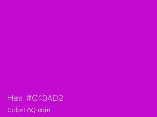 Hex #c40ad2 Color is a normal magenta color and the nearest color is Deep Magenta #cc00cc. Hex code #c40ad2 and RGB value is rgb(196,10,210). In RGB color space, this color is composed of 77% red, 4% green, 82% blue, In CMYK color space, this color is composed of 7% cyan, 95% magenta, 0% yellow , 18% black , In HSL color space, this color has a hue angle of 296° , 91% saturation and 43% lightness.