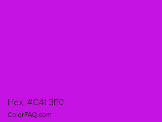 Hex #c413e0 Color is a normal magenta color and the nearest color is Vivid Mulberry #b80ce3. Hex code #c413e0 and RGB value is rgb(196,19,224). In RGB color space, this color is composed of 77% red, 7% green, 88% blue, In CMYK color space, this color is composed of 13% cyan, 92% magenta, 0% yellow , 12% black , In HSL color space, this color has a hue angle of 292° , 84% saturation and 48% lightness.