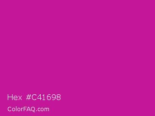 Hex #c41698 Color is a normal magenta color and the nearest color is Red Violet #c71585. Hex code #c41698 and RGB value is rgb(196,22,152). In RGB color space, this color is composed of 77% red, 9% green, 60% blue, In CMYK color space, this color is composed of 0% cyan, 89% magenta, 22% yellow , 23% black , In HSL color space, this color has a hue angle of 315° , 80% saturation and 43% lightness.