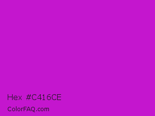 Hex #c416ce Color is a normal magenta color and the nearest color is Deep Magenta #cc00cc. Hex code #c416ce and RGB value is rgb(196,22,206). In RGB color space, this color is composed of 77% red, 9% green, 81% blue, In CMYK color space, this color is composed of 5% cyan, 89% magenta, 0% yellow , 19% black , In HSL color space, this color has a hue angle of 297° , 81% saturation and 45% lightness.
