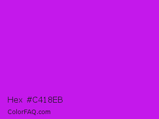Hex #c418eb Color is a normal purple color and the nearest color is Vivid Mulberry #b80ce3. Hex code #c418eb and RGB value is rgb(196,24,235). In RGB color space, this color is composed of 77% red, 9% green, 92% blue, In CMYK color space, this color is composed of 17% cyan, 90% magenta, 0% yellow , 8% black , In HSL color space, this color has a hue angle of 289° , 84% saturation and 51% lightness.