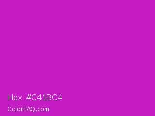 Hex #c41bc4 Color is a normal magenta color and the nearest color is Steel Pink #cc33cc. Hex code #c41bc4 and RGB value is rgb(196,27,196). In RGB color space, this color is composed of 77% red, 11% green, 77% blue, In CMYK color space, this color is composed of 0% cyan, 86% magenta, 0% yellow , 23% black , In HSL color space, this color has a hue angle of 300° , 76% saturation and 44% lightness.