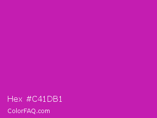 Hex #c41db1 Color is a normal magenta color and the nearest color is Byzantine #bd33a4. Hex code #c41db1 and RGB value is rgb(196,29,177). In RGB color space, this color is composed of 77% red, 11% green, 69% blue, In CMYK color space, this color is composed of 0% cyan, 85% magenta, 10% yellow , 23% black , In HSL color space, this color has a hue angle of 307° , 74% saturation and 44% lightness.