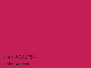 Hex #c41f54 Color is a normal rose color and the nearest color is Rose Red #c21e56. Hex code #c41f54 and RGB value is rgb(196,31,84). In RGB color space, this color is composed of 77% red, 12% green, 33% blue, In CMYK color space, this color is composed of 0% cyan, 84% magenta, 57% yellow , 23% black , In HSL color space, this color has a hue angle of 341° , 73% saturation and 45% lightness.