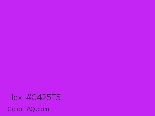 Hex #c425f5 Color is a normal purple color and the nearest color is Vivid Mulberry #b80ce3. Hex code #c425f5 and RGB value is rgb(196,37,245). In RGB color space, this color is composed of 77% red, 15% green, 96% blue, In CMYK color space, this color is composed of 20% cyan, 85% magenta, 0% yellow , 4% black , In HSL color space, this color has a hue angle of 286° , 91% saturation and 55% lightness.