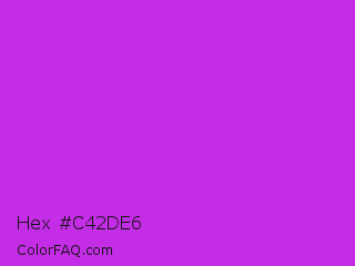 Hex #c42de6 Color is a normal purple color and the nearest color is Steel Pink #cc33cc. Hex code #c42de6 and RGB value is rgb(196,45,230). In RGB color space, this color is composed of 77% red, 18% green, 90% blue, In CMYK color space, this color is composed of 15% cyan, 80% magenta, 0% yellow , 10% black , In HSL color space, this color has a hue angle of 289° , 79% saturation and 54% lightness.