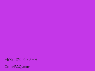 Hex #c437e8 Color is a normal purple color and the nearest color is Steel Pink #cc33cc. Hex code #c437e8 and RGB value is rgb(196,55,232). In RGB color space, this color is composed of 77% red, 22% green, 91% blue, In CMYK color space, this color is composed of 16% cyan, 76% magenta, 0% yellow , 9% black , In HSL color space, this color has a hue angle of 288° , 79% saturation and 56% lightness.