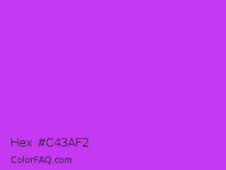 Hex #c43af2 Color is a normal purple color and the nearest color is Steel Pink #cc33cc. Hex code #c43af2 and RGB value is rgb(196,58,242). In RGB color space, this color is composed of 77% red, 23% green, 95% blue, In CMYK color space, this color is composed of 19% cyan, 76% magenta, 0% yellow , 5% black , In HSL color space, this color has a hue angle of 285° , 88% saturation and 59% lightness.