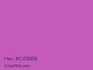 Hex #c45bbb Color is a normal magenta color and the nearest color is Fuchsia Pink #c154c1. Hex code #c45bbb and RGB value is rgb(196,91,187). In RGB color space, this color is composed of 77% red, 36% green, 73% blue, In CMYK color space, this color is composed of 0% cyan, 54% magenta, 5% yellow , 23% black , In HSL color space, this color has a hue angle of 305° , 47% saturation and 56% lightness.