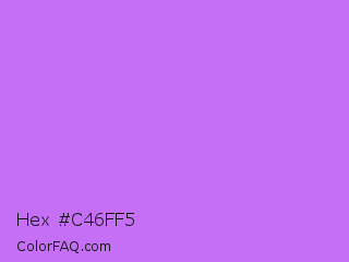 Hex #c46ff5 Color is a light purple color and the nearest color is Heliotrope #df73ff. Hex code #c46ff5 and RGB value is rgb(196,111,245). In RGB color space, this color is composed of 77% red, 44% green, 96% blue, In CMYK color space, this color is composed of 20% cyan, 55% magenta, 0% yellow , 4% black , In HSL color space, this color has a hue angle of 278° , 87% saturation and 70% lightness.