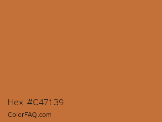 Hex #c47139 Color is a normal orange color and the nearest color is Copper #b87333. Hex code #c47139 and RGB value is rgb(196,113,57). In RGB color space, this color is composed of 77% red, 44% green, 22% blue, In CMYK color space, this color is composed of 0% cyan, 42% magenta, 71% yellow , 23% black , In HSL color space, this color has a hue angle of 24° , 55% saturation and 50% lightness.